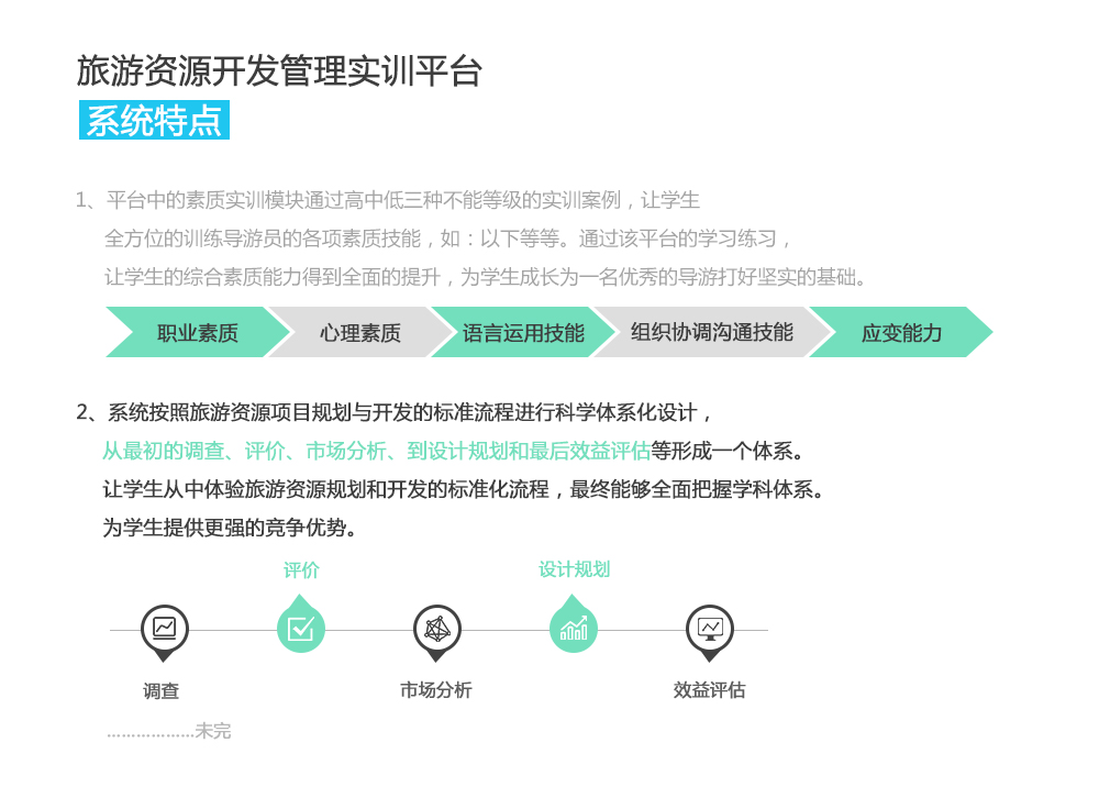 2、系统按照旅游资源项目规划与开发的标准流程进行科学体系化设计,从最初的调查、评价、市场分析、到设计规划和最后效益评估等形成一个体系。让学生从中体验旅游资源规划和开发的标准化流程,最终能够全面把握学科体系。为学生提供更强的竞争优势。