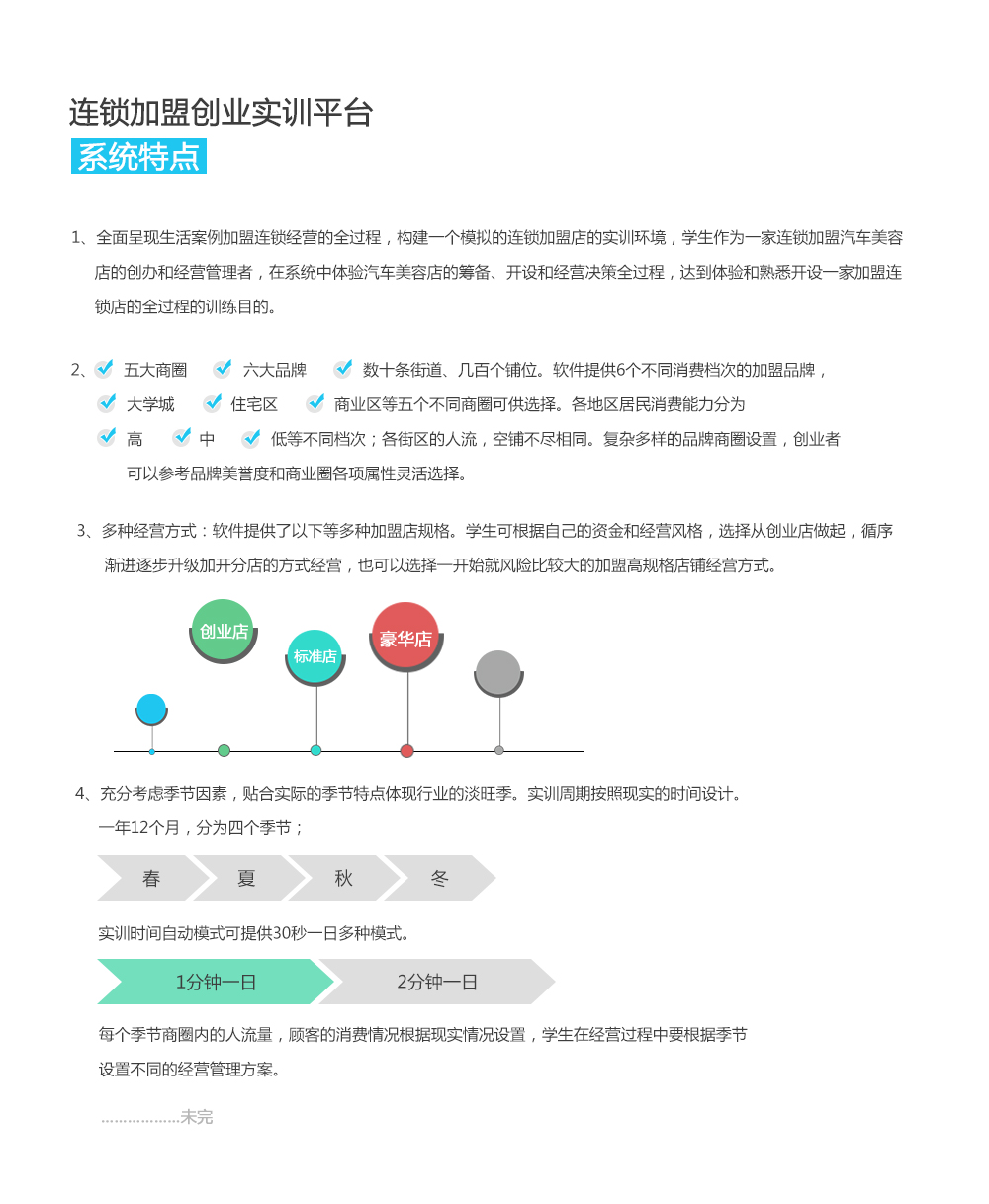 1、根据加盟规则选择不同区域的商圈进行加盟,用科学的算法体现了商业圈中的日人流量、日进店人数、顾客回头率、顾客购买比例、日消费人数、进店率以及进店率竞争衰退等相关数据。学生在这个模拟的商圈中进行店铺的开设和经营管理活动,体验创业经营的全过程。系统根据每个人的店铺规模、经营业绩来对学生进行排名,增加实训的对抗性和娱乐性。