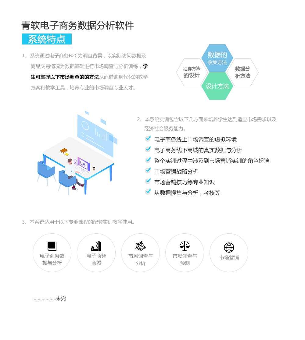 3、本系统适用于电子商务数据与分析、电子商务商城、市场调查与分析、市场调查与预测、市场营销等专业课程的配套实训教学使用。