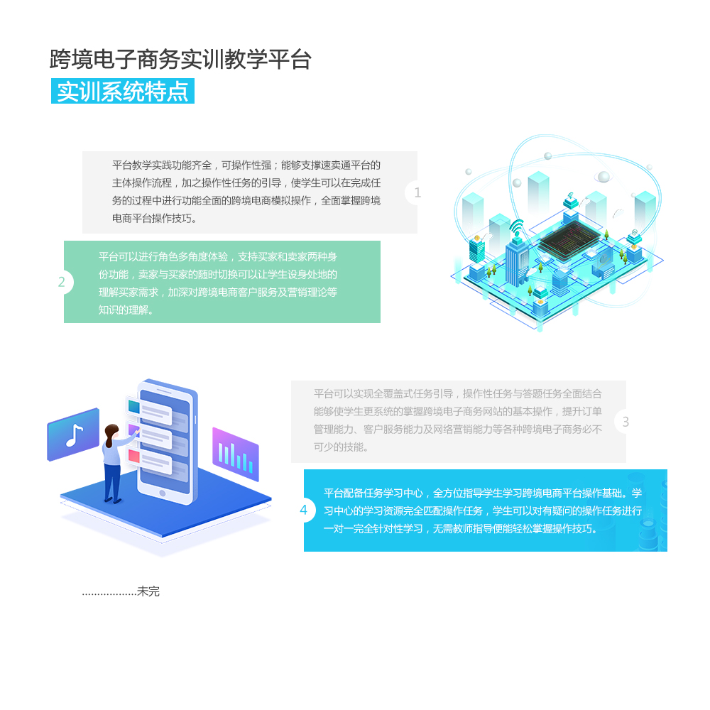 1、平台教学实践功能齐全,可操作性强;能够支撑速卖通平台的主体操作流程,加之操作性任务的引导,使学生可以在完成任务的过程中进行功能全面的跨境电商模拟操作,全面掌握跨境电商平台操作技巧。