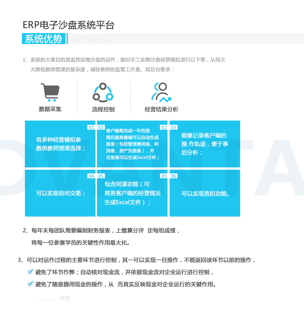 1、系统的主要目的是监控实物沙盘的运作,能对手工实物沙盘经营模拟进行数据采集、流程控制、经营结果分析等,从而大大降低教师授课的复杂度,减轻教师的监管工作量。其后台要求: