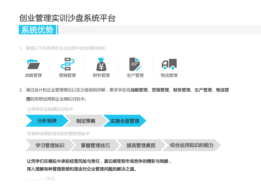 为满足学校学生创业实践教育,利用校内实验实训环境,让学生直观的了解企业的创业思路、创业过程和创业评估,青软创业实践教学沙盘就能够满足这些,从企业内部采购、生产、销售的供应链管理、企业外部上下游分销配送的连锁管理,以及会计、营销等相关知识实践训练。