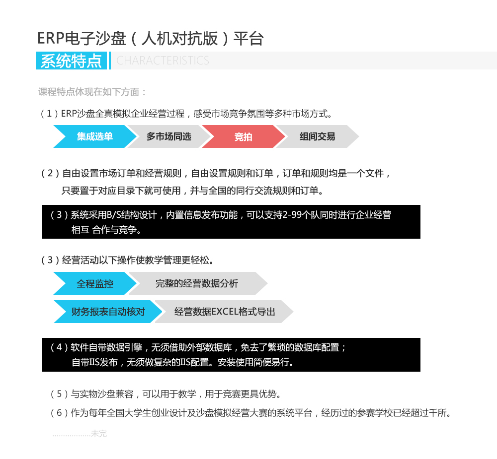 (1)ERP沙盘全真模拟企业经营过程,感受市场竞争氛围,集成选单、多市场同选、竞拍、组间交易等多种市场方式。