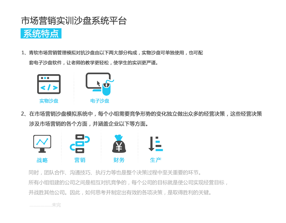 1、青软市场营销管理模拟对抗沙盘由实物沙盘和电子沙盘两大部分构成,实物沙盘可单独使用,也可配套电子沙盘软件,让老师的教学更轻松,使学生的实训更严谨。