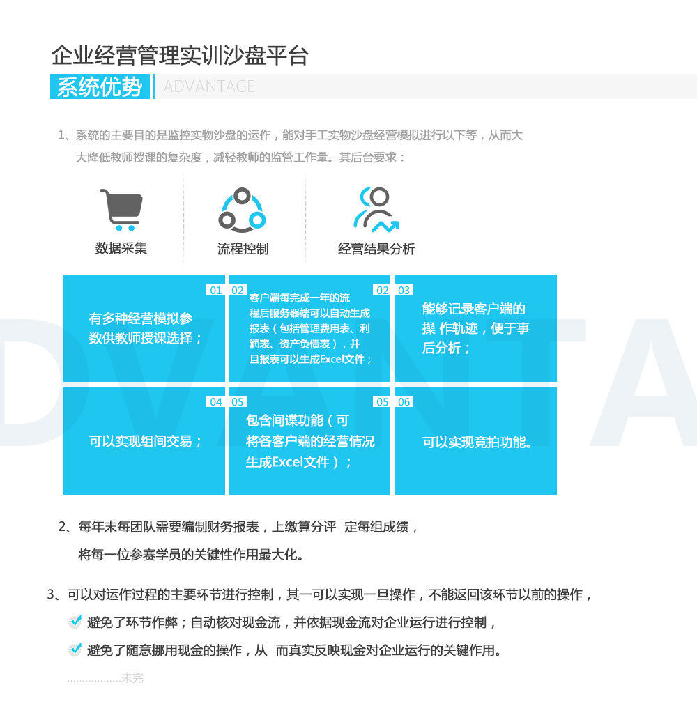 4、提供物理沙盘分析平台,能对手工实物沙盘经营模拟进行数据采集、流程控制、经营结果分析。