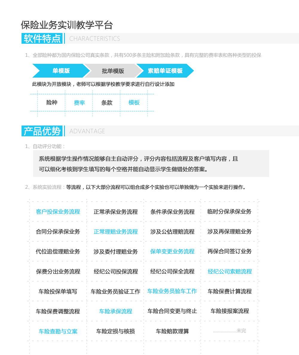 1、全部险种都为国内保险公司真实条款,共有500多条主险和附加险条款,具有完整的费率表和各种类型的投保单模版、批单模版、索赔单证模板,此模块为开放模块,老师可以根据学校教学要求进行自行设计添加险种、费率、条款、模板。