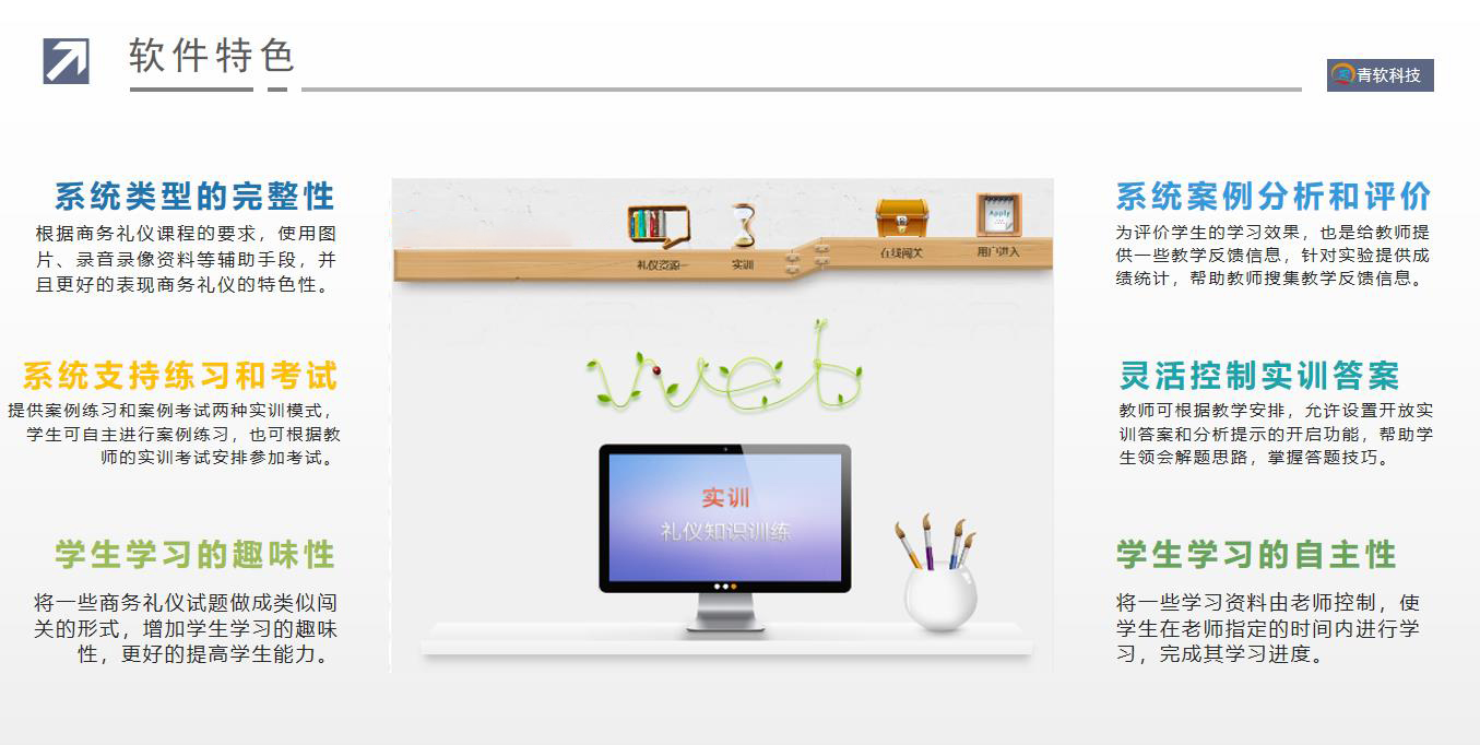 1、系统类型的完整性:根据酒店形体礼仪课程的要求,使用图片、录音录像资料等辅助手段,并且更好的表现酒店形体礼仪的特色性。