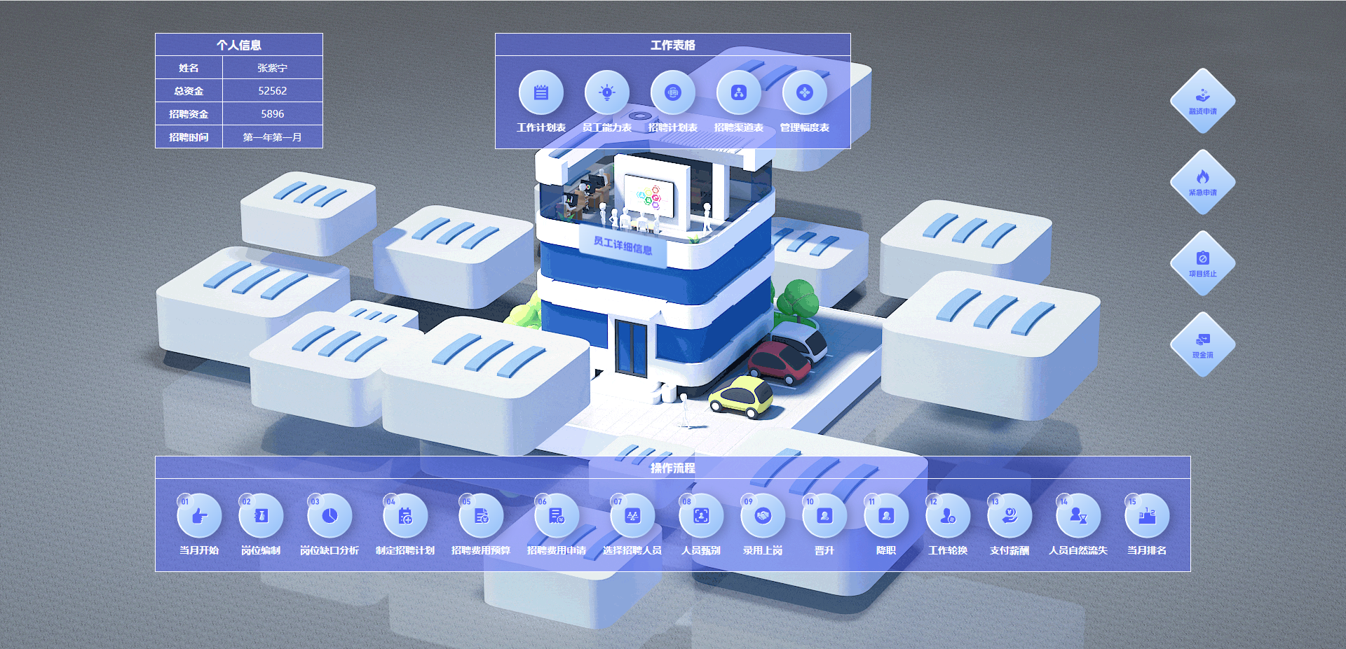 3.4.2、实战训练:在实战系统模块中,设计了岗位编制、岗位缺口分析、制定招聘计划、费用预算、人员甄选和录用、员工晋升、岗位轮换、支付薪酬、人员流失、排名等步骤,以对抗竞争的模式开展招聘与甄选活动,对招聘与甄选活动进行系统、综合的实战训练。