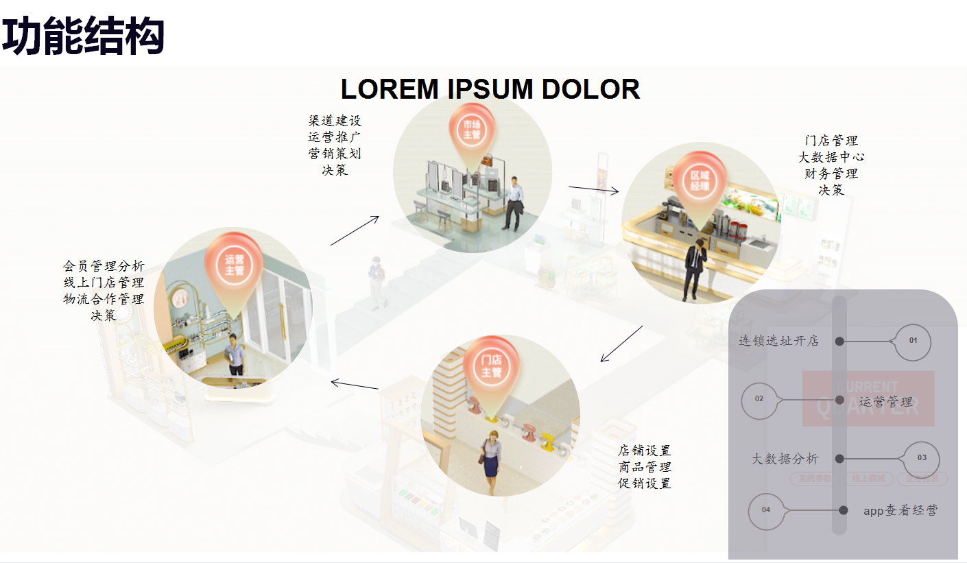 2、运营主管:包括会员管理分析、线上门店管理、物流合作管理、历史决策等功能。