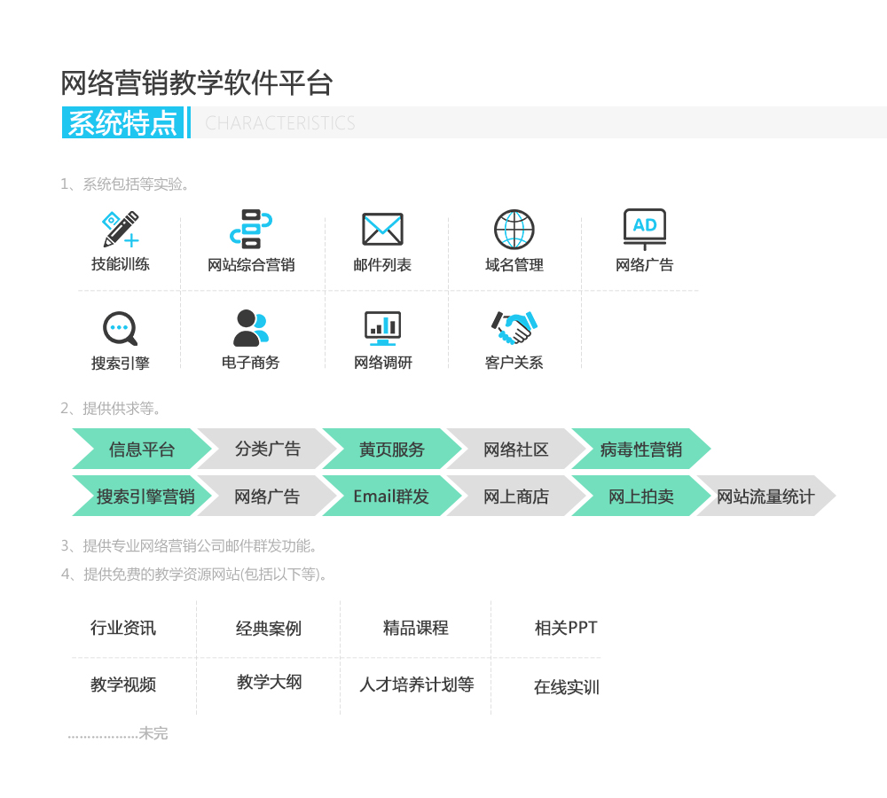 2、系统内嵌域名注册、域名服务商、搜索服务商、网络广告服务商、电子商务服务商、网络调研、网络调研服务商、网站建设、网络广告、搜索引擎、Email、电子商务B2B/B2C/C2C、客户关系、微信营销16个实训模块让学生体验多种网络营销方式,提升学生综合素质与专业技能。