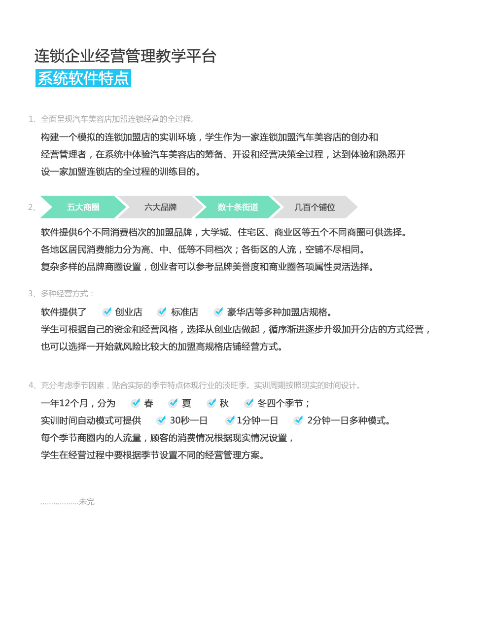 1、全面呈现汽车美容店加盟连锁经营的全过程。构建一个模拟的连锁加盟店的实训环境,学生作为一家连锁加盟汽车美容店的创办和经营管理者,在系统中体验汽车美容店的筹备、开设和经营决策全过程,达到体验和熟悉开设一家加盟连锁店的全过程的训练目的。