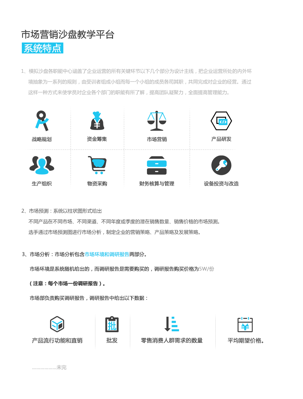 1、本系统是集战略分析、策略制定、对抗竞争与团队协作于一体的营销物理沙盘,以季度为单位,模拟经销商商业运作过程。学生分组组成多家公司,每家公司在一张沙盘盘面上运作,在初始条件相同的情况下,在沙盘中按照运营规划和市场竞争进行竞争模拟。