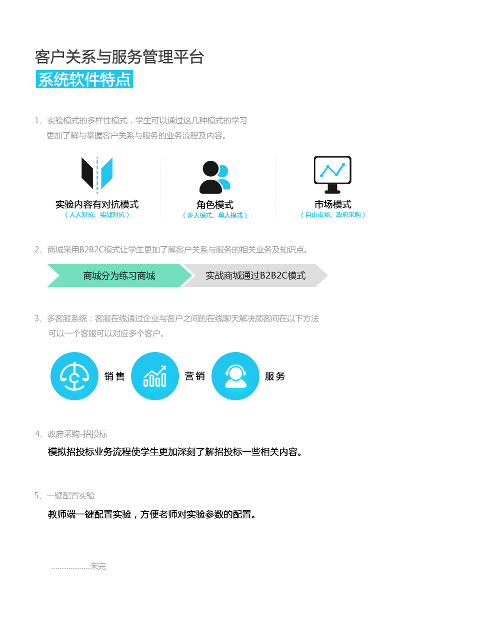 实验内容有对抗模式(人人对抗、实战对抗),角色模式(多人模式、单人模式),市场模式(自由市场、政府采购),学生可以通过这几种模式的学习更加了解与掌握客户关系与服务的业务流程及内容。