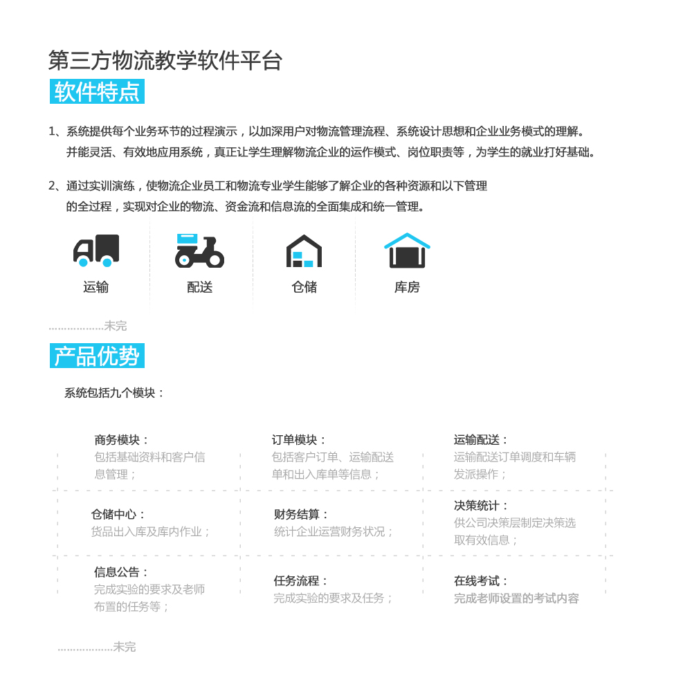 让学生可以简单清晰的掌握物流管理系统的整个流程,让学生进行从客户需求,商务解析、货物入库、在库、出库、配送作业操作、车辆调度处理等流程的实际演练,理解物流各个环节的操作原理和逻辑关系。