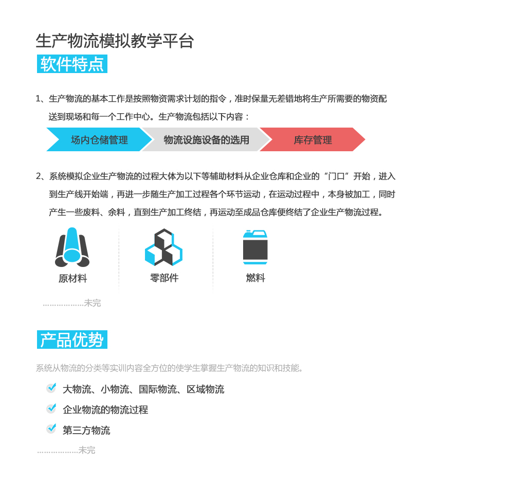 1、系统从物流的分类(大物流、小物流、国际物流、区域物流)、企业物流的物流过程、第三方物流等实训内容全方位的使学生掌握生产物流的知识和技能。