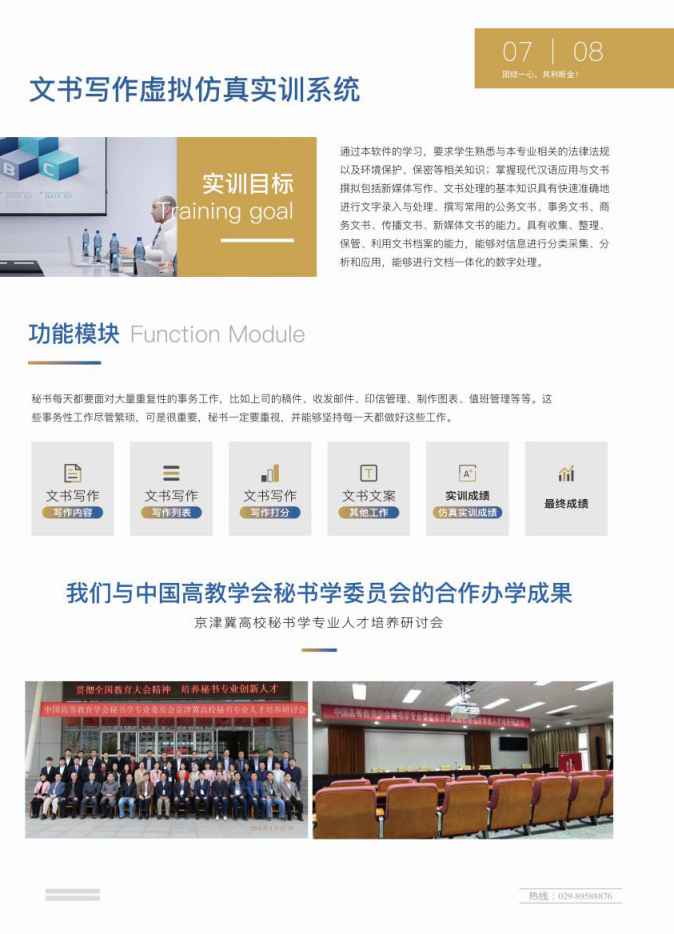 2、系统提供不少于以下文书写作实训:党政机关公文实训、事务文书实训、商务文书实训、传播文书实训、会务文书实训、公务书信实训、求职应聘文书实训等。写作背景按照情景植入、材料内容、任务要求进行分类,管理员端可自定义新增、修改文书写作内容及动态改变实训章节和任务,学生通过实训模块的定义完成不同实训内容并进行写作练习等,同时,教师端可实时监控学生的写作情况对其进行评价和考核打分。